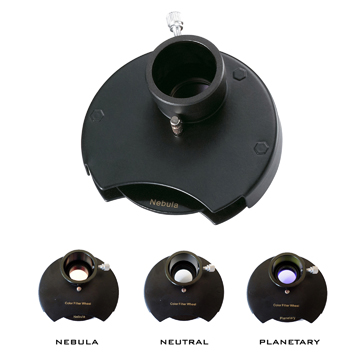 The Cassini Color Filter Wheel is another innovative device for telescopes from Cassini. Filtering out certain bands of light can be very useful when observing astronomical objects. Normally to use filters with your telescope you would have to thread the filters on and off of your eyepieces as you are use them. With the Cassini Color Filter Wheel, you simply switch eyepieces as you normally would. To switch filters, just rotate the dial on the Cassini Color Filter Wheel. The C.F.W. has three filter settings: Nebula, Planetary and Clear. The Nebular filter is great for filtering out light pollution such as ground light. UHC (Ultra High Contrast) filters block a large fraction of light pollution, and bring out the details of planetary nebulae and most of emission nebulae under a dark sky. The Planetary filter is great for viewing the moon and planets by increasing contrast - helps to bring out dark surface detail on Jupiter and Saturn, darkens the maria on Mars, and improves visual detail when viewing Neptune and Uranus. 3rd slot - Empty to use additional filter of your choice or left empty so objects can be viewed normally without having to remove the Color Filter Wheel. Additionally the filters are universal 1.25 threaded filters so you can switch them out with other filters for more usability.